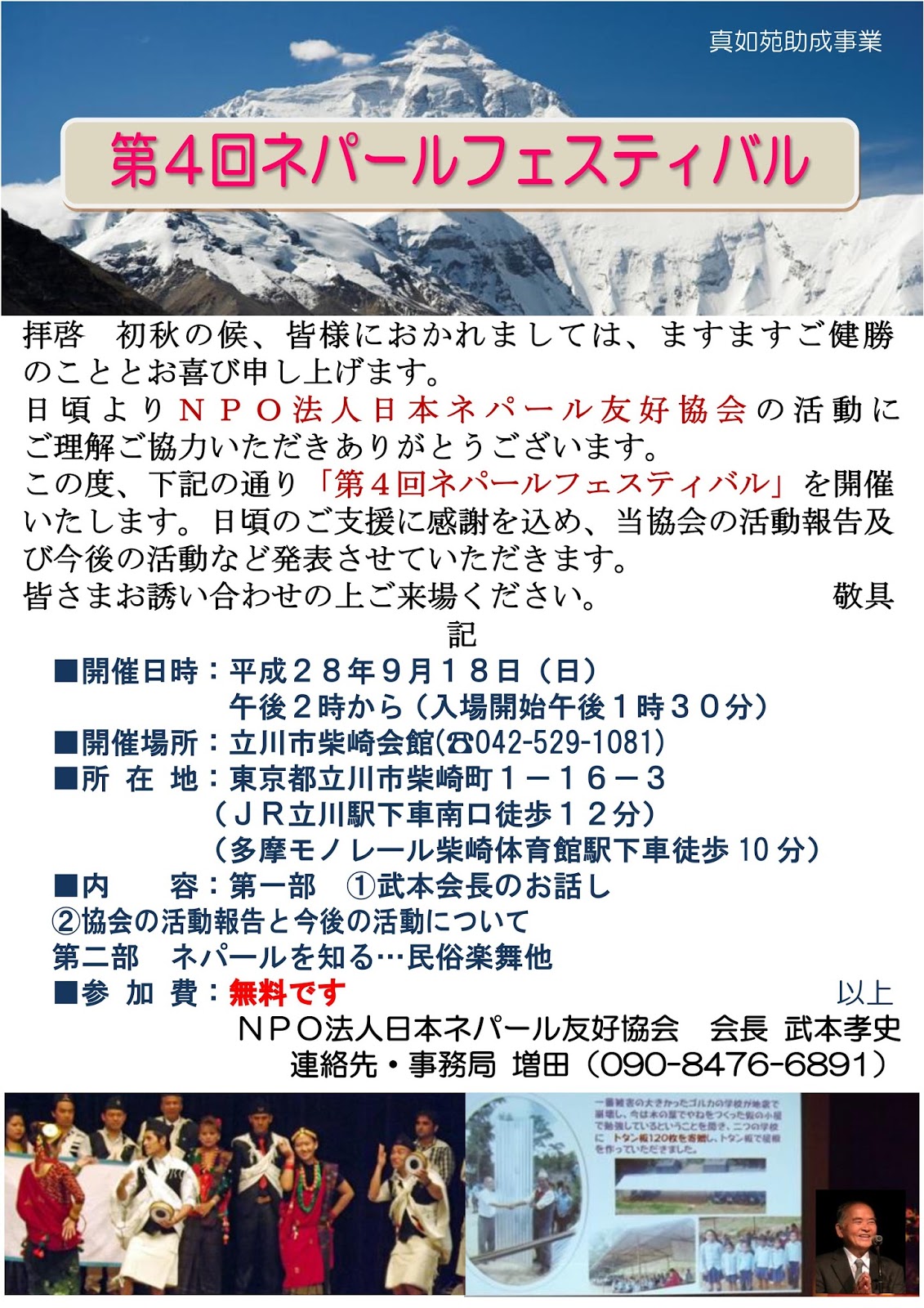 The 4th Nepal Festival was held. Date and time: Sunday, September 18, 2016, 2:00 p.m. to 4:30p.m. :…