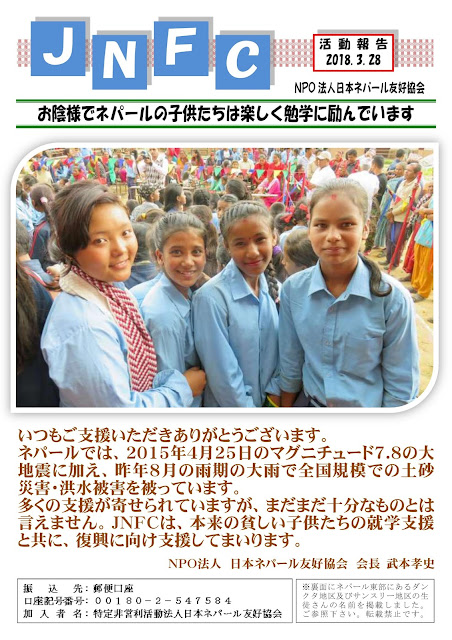 Thank you for your continued support.In Nepal, in addition to the 7.8 magnitude earthquake on April 25, 2015, heavy rains during the rainy season in August last year caused landslides and floods nationwide.Although we have received a lot of support, it is still not enough.At JNFC, we will support the schooling of originally poor children and provide support for reconstruction.